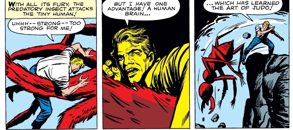 It’s such a wonderfully early-Marvel solution. No elaborate explanation. No training montage to foreshadow his fighting prowess. And it’s funny — but it’s also very of its time. 1950s fiction loved the idea that intellect and discipline could overcome overwhelming odds. Even when you’re microscopic and facing down an insect the size of a truck.