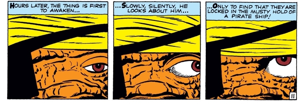 Ben as Blackbeard is ridiculous and perfect at the same time. There is a page where Kirby uses three panels to show close-ups on Ben’s eye as he wakes up in the hold of the ship that create this slow burn drama that’s like nothing I’ve seen before while reading these books. Kirby’s storytelling is leaping forward issue by issue.