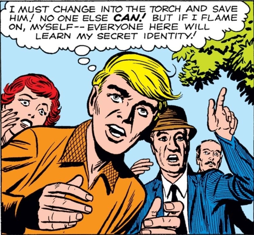 The book makes a point of explaining that everyone knows Sue Storm is the Invisible Girl. But somehow Johnny — living in the same house, going to high school on Long Island — can just… blend in.
