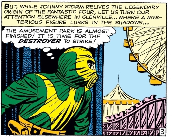 A disposable villain called The Destroyer threatens a local amusement park. Johnny goes to great lengths to protect his secret identity, even when it feels unnecessarily dangerous — filling rooms with smoke, throwing fireballs in crowded spaces, generally being far more reckless than the situation calls for.