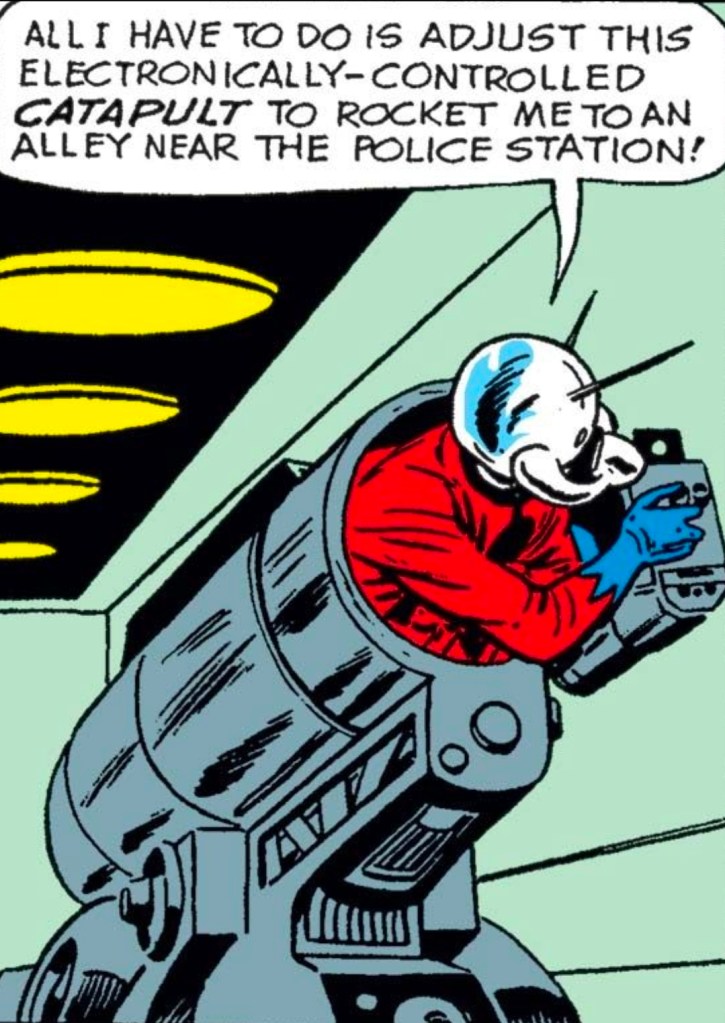 Hank Pym has embraced the role. He’s monitoring police radio. Tracking down bank robbers. Operating out of a lab that now feels more like a headquarters — complete with a catapult gun that launches him into action. He’s less a reclusive scientist and more a pulp-style detective, dropped into a superhero framework.